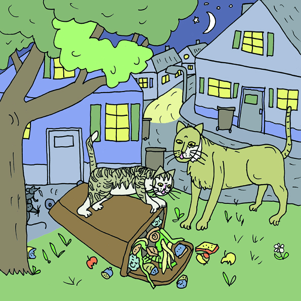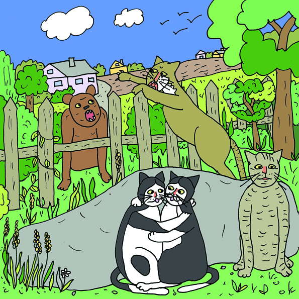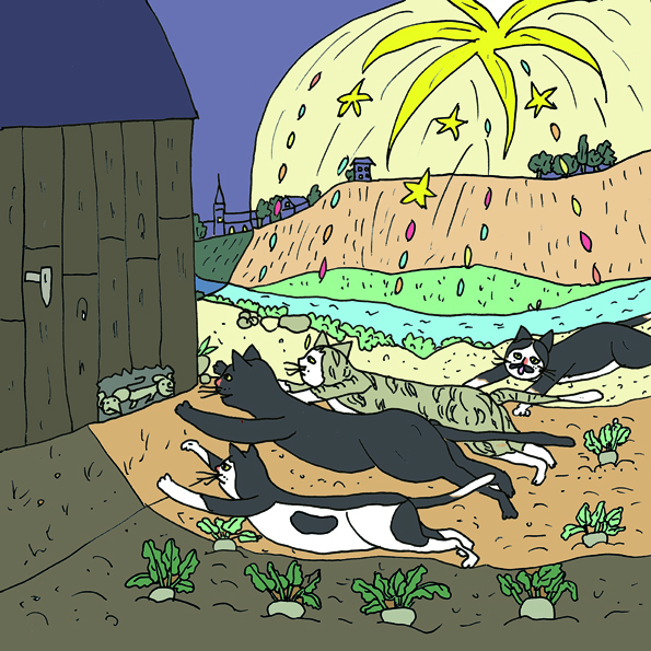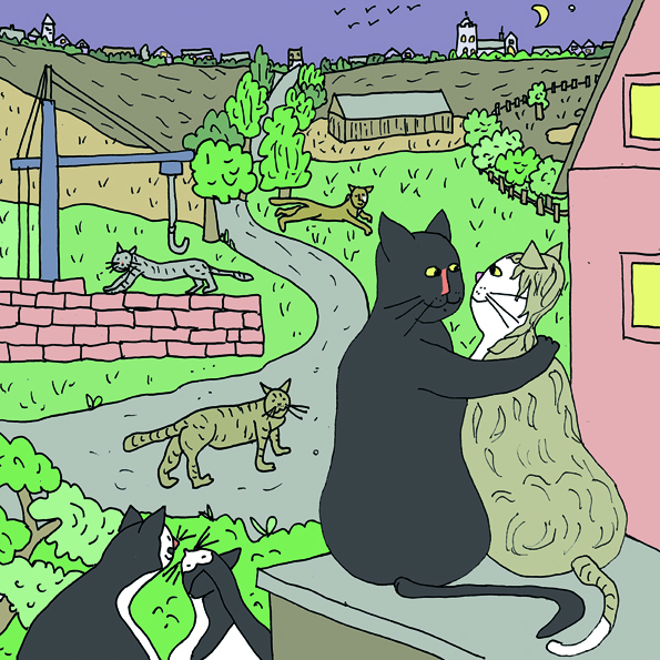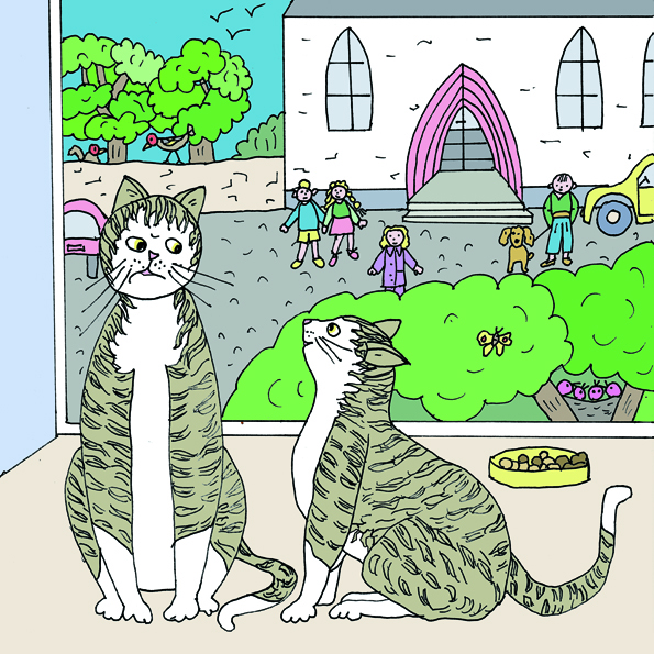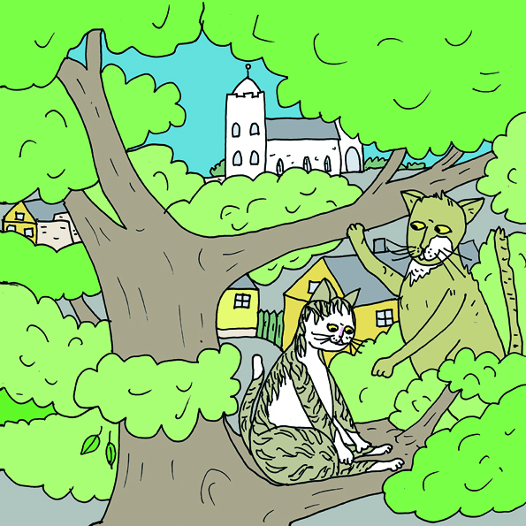 Mizzi und Nero sitzen auf dem Schuppendach und sehen in der Ferne den Kirchturm einer Stadt.